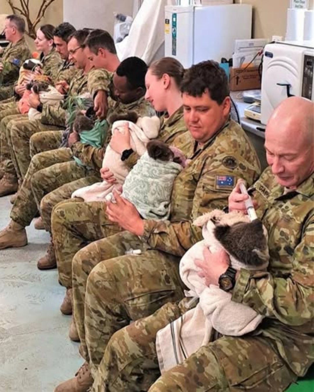 The soldiers gently cradled the trembling koalas, offering warmth and comfort instead of weapons. One powerful image captured the essence of the moment—lines of soldiers holding fragile koalas, their eyes filled with empathy and kindness. 🐨✨